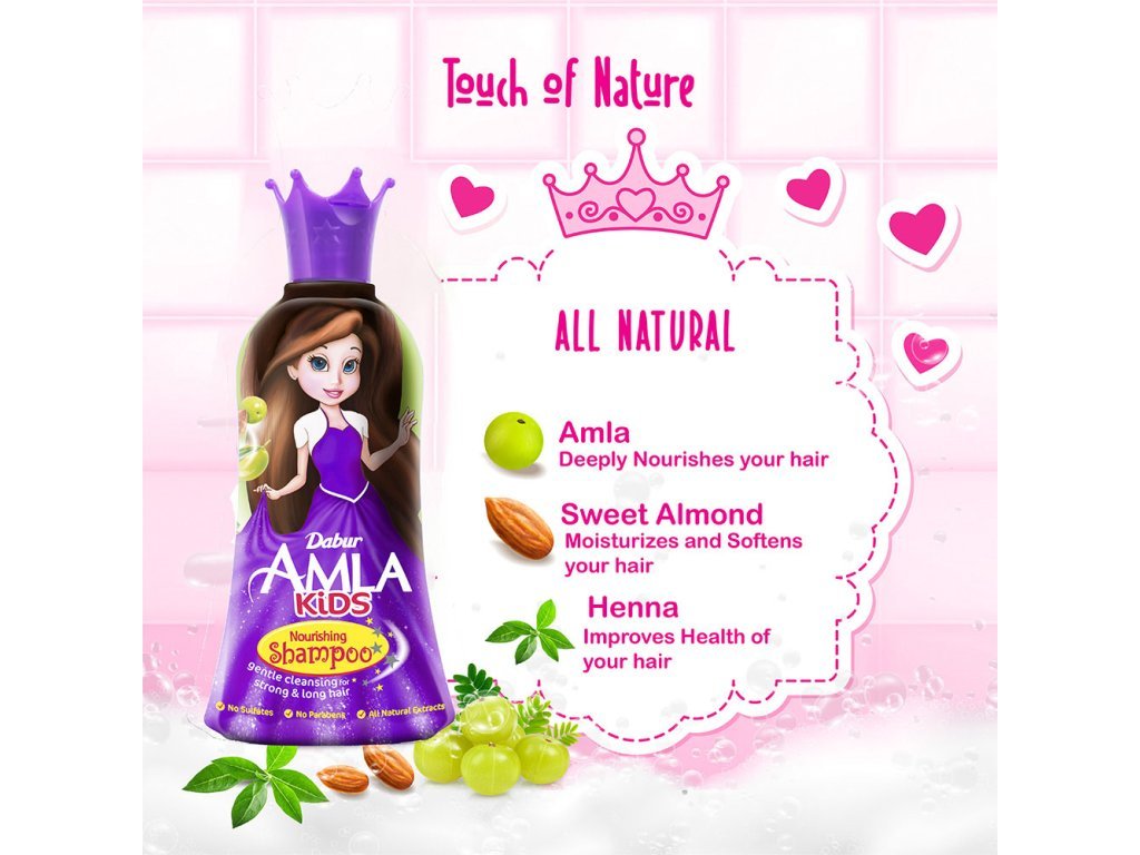 Dabur Amla Kids výživný šampon je produkt jemného složení, bez sulfátů a parabenů. Takže vyměňte drsné šampony na bázi chemikálií z vašeho domova a dodejte vlasům vašich dětí výživu z mandlových a amla extraktů pro delší, silnější a lesklé vlasy. Jedna z jeho hlavních složek Shikakai, je bohatá na vitamíny a antioxidanty, které dělá vlasy lesklé a přirozeně čistí pokožku hlavy & vlasy, zlepšení textury vlasů.