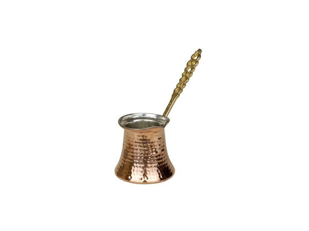 Džezvy s úzkým hrdlem jsou velmi tradiční a jsou klíčem k přípravě dobré turecké kávy.Ručně vyráběná měděná džezva. Je vyrobena tradiční řemeslnou metodou. Objem: 250ml Měď byla preferována v kuchyni mnoho staletí pro její bezpečnost a zdravé vaření. Materiál je známý pro vysokou tepelnou vodivost mědi a umožňuje snadný a rychlý ohřev, a tím pádem se také ušetří elektrická energie. Materiál: měď, cín, rukojeť slitina,plášť - tepaná měď, vnitřek - potravinářský cín Objem: 250ml (velikost se může u jednotlivých kusů mírně lišit) Průměr dna: cca 7,5 cm Země původu: Turecko 100% ruční výroba Upozornění: Nádoba není vhodná k přípravě kávy na indukci. O džezvě: Vaření kávy v džezvě je jednou z nejstarších metod přípravy kávy. Džezvy - tyto krásné malé konvičky se používaly v horkém pouštním písku v arabských a tureckých kulturách, kde se káva připravovala stovky let, dlouho předtím, než se stala populární na Západě. Postup je poměrně jednoduchý. Do džezvy se vlije kvalitní voda a dá se pomalu vařit (někdy rovnou i s cukrem - podle libosti). Přidá se velmi jemně mletá káva. Zamíchá se to. Jak se voda začíná vařit, v úzkém hrdle začne stoupat pěna. Džezva se nadzvedne, pěna se vmíchá dovnitř a nádoba se dá znovu zahřívat. Toto se několikrát opakuje. (3x) Poté se nádoba stáhne z ohně a kávová sedlina se usadí. Vaření obvykle trvá nejméně sedm minut, a toto je správný, pomalý a záměrný způsob přípravy kávy. Docílíte tím skutečně správné chuti a aroma kávy. Výsledná káva je hustá, s intenzivní chutí, s ještě větší usazeninou a „žvýkavostí“ než šálek kávy typu French press. Obvykle se pije v malých množstvích – oblíbeným způsobem podávání jsou šálky demitasse nebo na espresso. Turecká káva bývá také slazena a kořeněna – do konvice s kávou se přidává cukr a mletý kardamom nebo skořice. Nezbytné je podávat s kávou i sklenku vody. Často se káva podává s datlemi, fíky, lukumem apod.